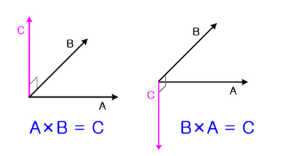 그림과 같이 벡터A와 B가 있고 서로 외적을 하는 순서에 따라 결과가 달라지는 것을 알 수 있다.