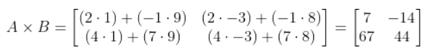 - 두개의 행렬을 곱하려면 두 행렬 모두 A의 열의 개수와 B의 행의 개수가 같아야한다.