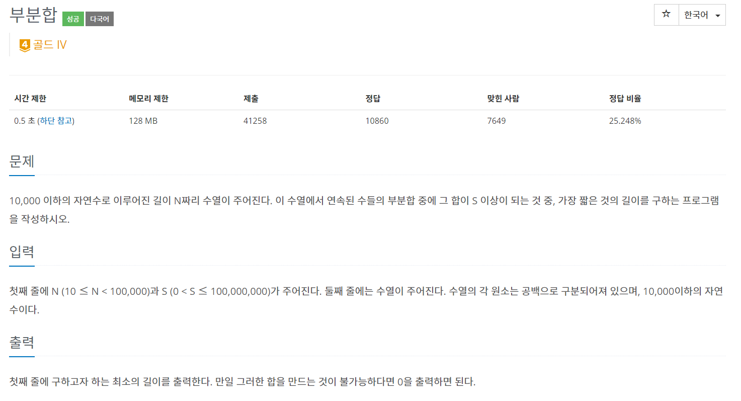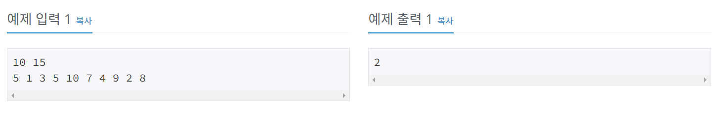 첫째 줄에 N (10 ≤ N < 100,000)과 S (0 < S ≤ 100,000,000)가 주어진다. 둘째 줄에는 수열이 주어진다. 수열의 각 원소는 공백으로 구분되어져 있으며, 10,000이하의 자연수이다.