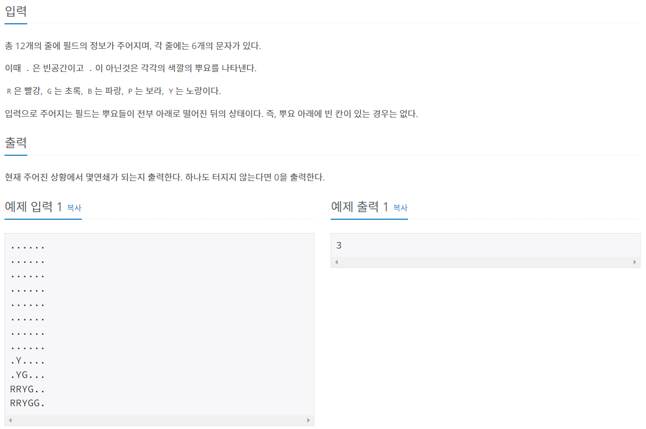 총 12개의 줄에 필드의 정보가 주어지며, 각 줄에는 6개의 문자가 있다. 이때 .은 빈공간이고 .이 아닌것은 각각의 색깔의 뿌요를 나타낸다. R은 빨강, G는 초록, B는 파랑, P는 보라, Y는 노랑이다.